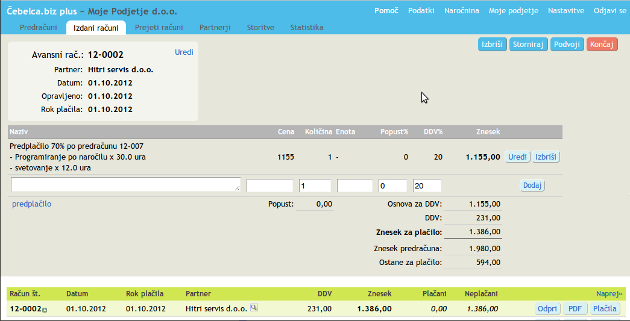 - Če ga želite natisniti, v vrstici računa pritisnete PDF, nato pa Odpri neposredno in ga lahko natisnete. Če ga želite poslati partnerju po e-pošti, pritisnete Pošlji po e-pošti. Če bi želeli napisati še en račun z večinoma enakimi podatki, v vrstici računa pritisnete Odpri in potem Podvoji.