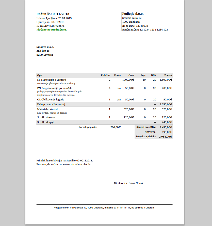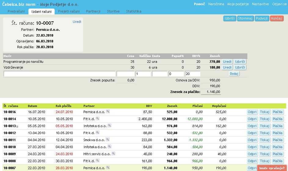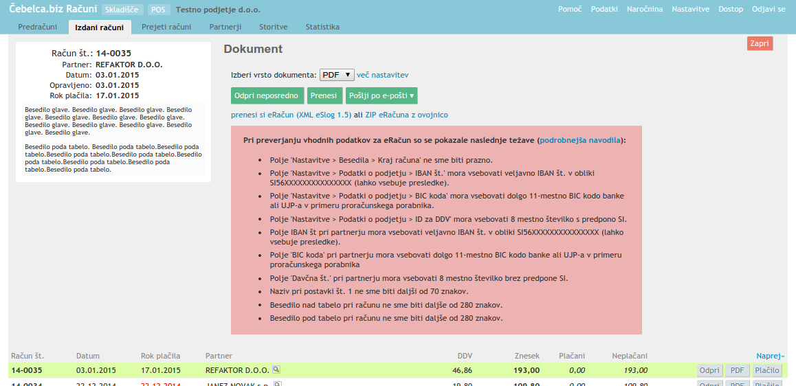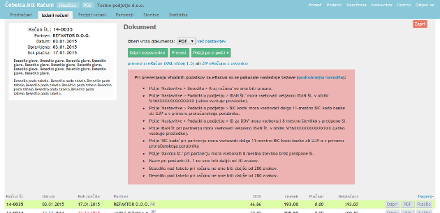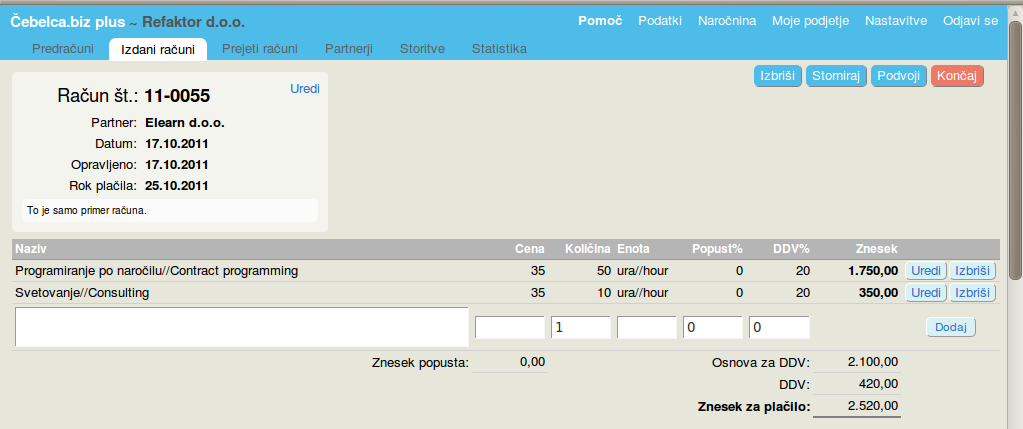 - Če ga želite natisniti, v vrstici računa pritisnete PDF, nato pa Odpri neposredno in ga lahko natisnete. Če ga želite poslati partnerju po e-pošti, pritisnete Pošlji po e-pošti. Če bi želeli napisati še en račun z večinoma enakimi podatki, v vrstici računa pritisnete Odpri in potem Podvoji.