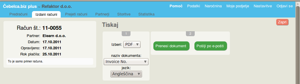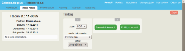 V obrazcu za tiskanje (PDF > več opcij) nastavite jezik dokumenta. Račun lahko natisnete samo v slovenščini ali samo v angleščini. (glej naslednjo točko)
