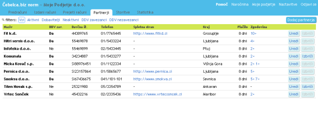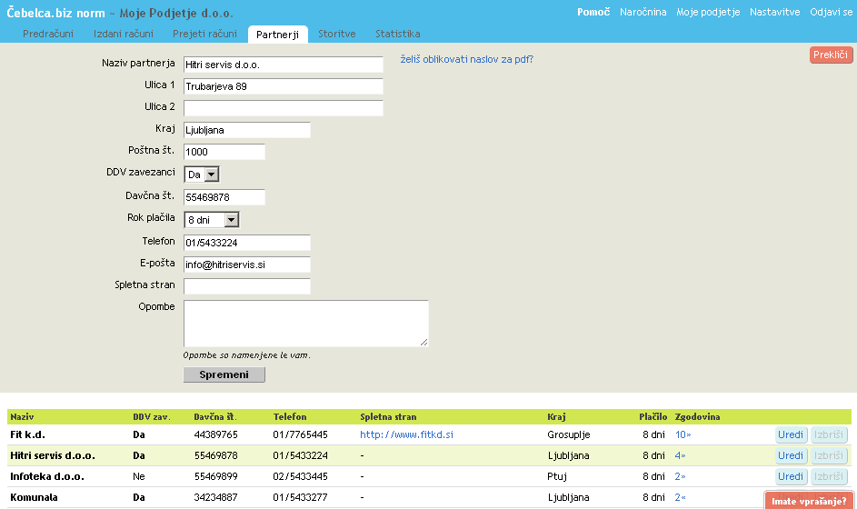 Če pa se spremenijo bistveni podatki pri partnerju, npr naslov, davčna številka ali ID za DDV, naziv , pa je bolje, da dodate novega partnerja in od takrat naprej uporabljate novega.
