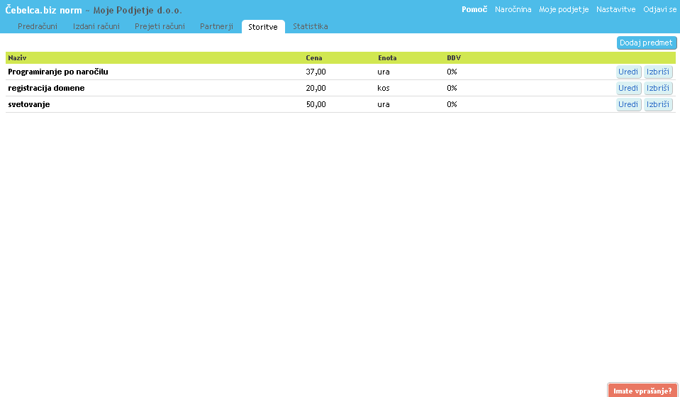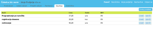 Storitev lahko napišete vsakokrat sproti, ko izdajate račune. Lahko pa si jih vnesete že v naprej, tako da v mapi Storitve pritisnete Dodaj predmet. Potem vam bo program sam predlagal storitev, ko boste napisali prvo črko ter vnesel tudi ceno in EM, kar pa boste lahko ob samem izdajanju računa spremenili.