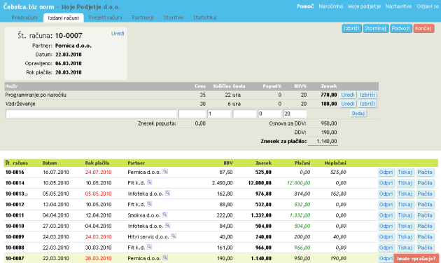 - Nato greste v zavihek Izdani računi in pritisnete Dodaj račun. Tam najprej vnesete partnerja (če še ni vnešen) s pritiskom na Dodaj partnerja. Zatem vnesete še vse ostale podatke, ki bodo na računu. Pritisnete Nadaljuj in vnesete še postavke (naziv storitve, cena, količina, mer.enota). S pritiskom na tipko Izdaj račun je račun izdan.